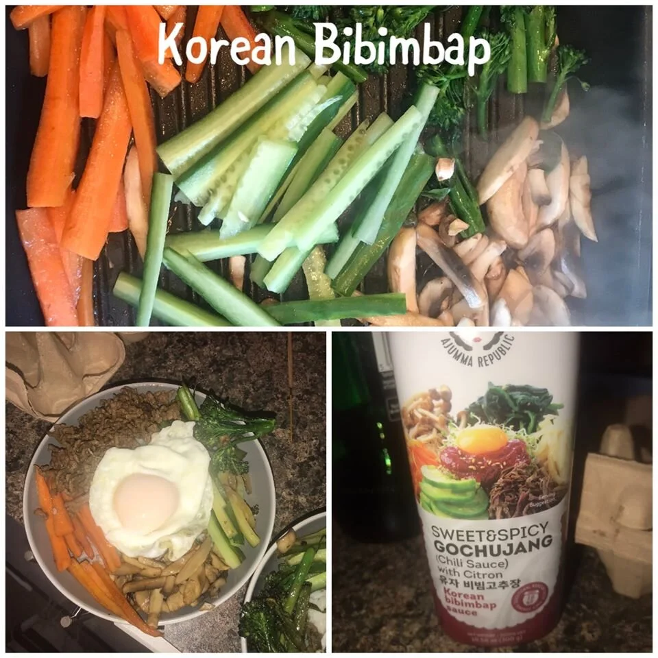 sticky rice, any combo of veg, special Korean sauce ordered online, minced meat if you wish, a raw fried egg and smash it all up together